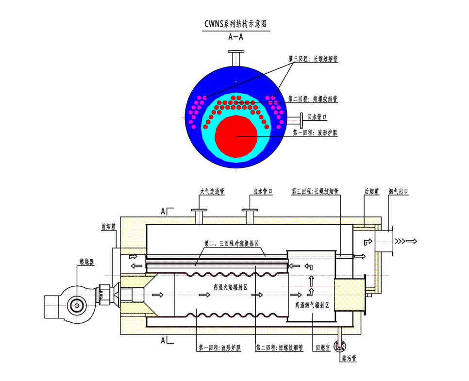CWNS係列全自動燃油(氣)臥式熱水鍋爐(實(shí)用新型專利),采用臥式三回程濕背結構,改善鍋爐運行(háng)環境,提高鍋爐效率和使用壽命;全部煙氣通道置於水中,尾部配有餘熱水箱及完善(shàn)的保溫外(wài)包設計,煙箱密封采用迷宮式結構,避免了煙箱(xiāng)漏煙現象。鍋爐熱效率高達90%以上,采用有良好膨脹性(xìng)能的波紋爐膽與錐形爐膽的組合爐膽,爐膽尺寸與(yǔ)火焰相吻合,煙(yān)氣流通麵積以次減小,使煙氣等速流動,高溫煙氣在爐內的熱交換時(shí)間,達到*佳傳熱效果;采(cǎi)用與鍋爐有效匹配的高性能燃燒機,進行自動調節,使燃燒充分,節省燃料,降低汙染;采(cǎi)用高保溫性能的超細玻璃棉,散熱損失更小;采用智能化節能控製係統(tǒng),對鍋爐及供水、供暖、自控水溫係統(tǒng)進行控製,結合不同負荷調節燃料供給,更加節(jiē)能。安裝方式為整體快(kuài)裝鍋爐,振(zhèn)動小,對地基(jī)無特殊要求,不需地腳螺栓固定,安裝簡單易行。 采用活動(dòng)爐(lú)頭結構,可匹配各種燃燒器,更換爐頭,維修爐體方便快捷。 前(qián)、後煙箱采(cǎi)用活動可拆結構,可方便地對鍋爐內部進行檢查、維護(hù)、保養,簡單、便捷,產品設計新穎(yǐng)、結(jié)構(gòu)合(hé)理,工藝性(xìng)能良好,使本(běn)產品具有不同(tóng)凡(fán)響的優異品質,是新開發的新款產品。